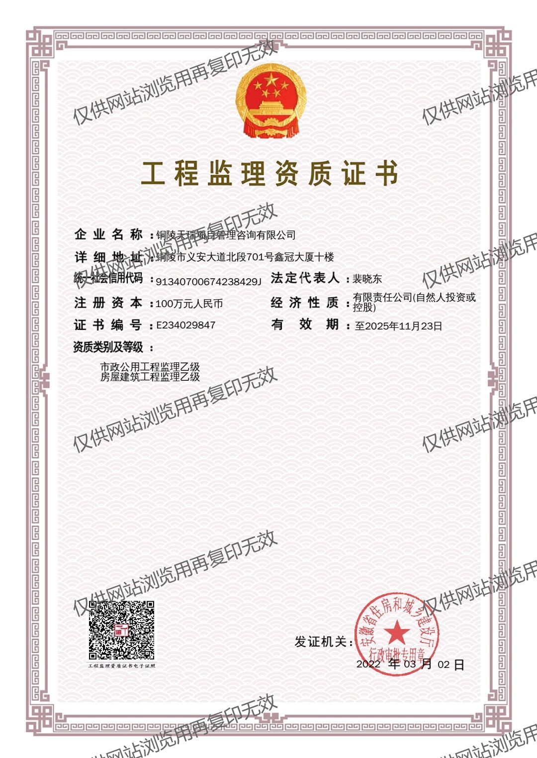 銅陵天瑞項(xiàng)目管理公司具有:工程監(jiān)理乙級(jí)資質(zhì)、工程造價(jià)乙級(jí)資質(zhì)、招標(biāo)代理及政府采購(gòu)資質(zhì)(備案)、工程咨詢資質(zhì)(備案)等資質(zhì)。